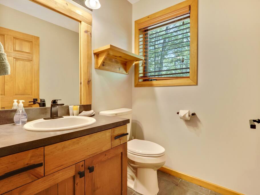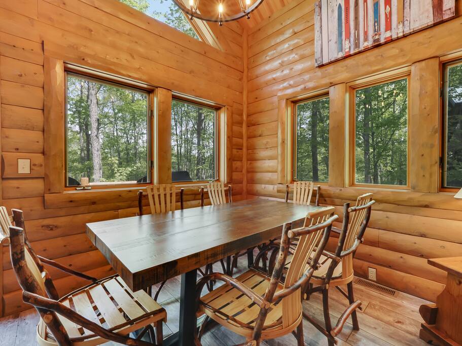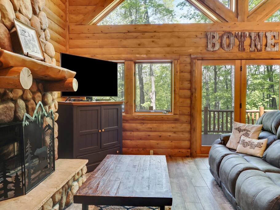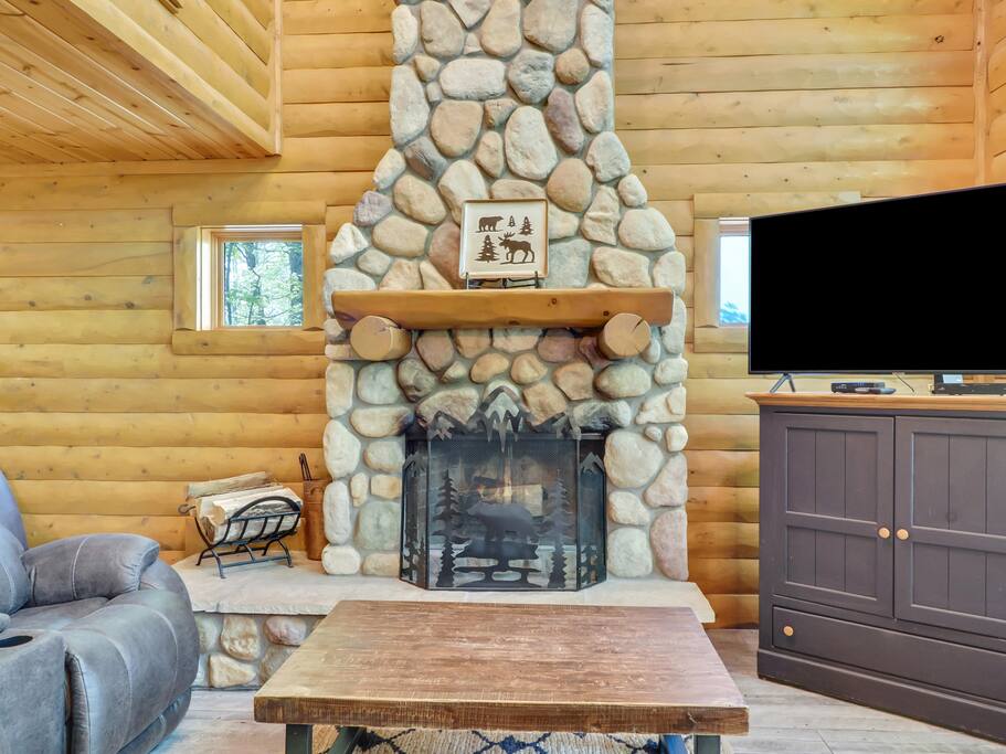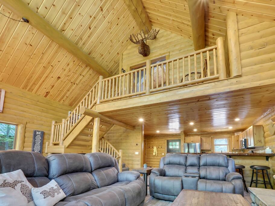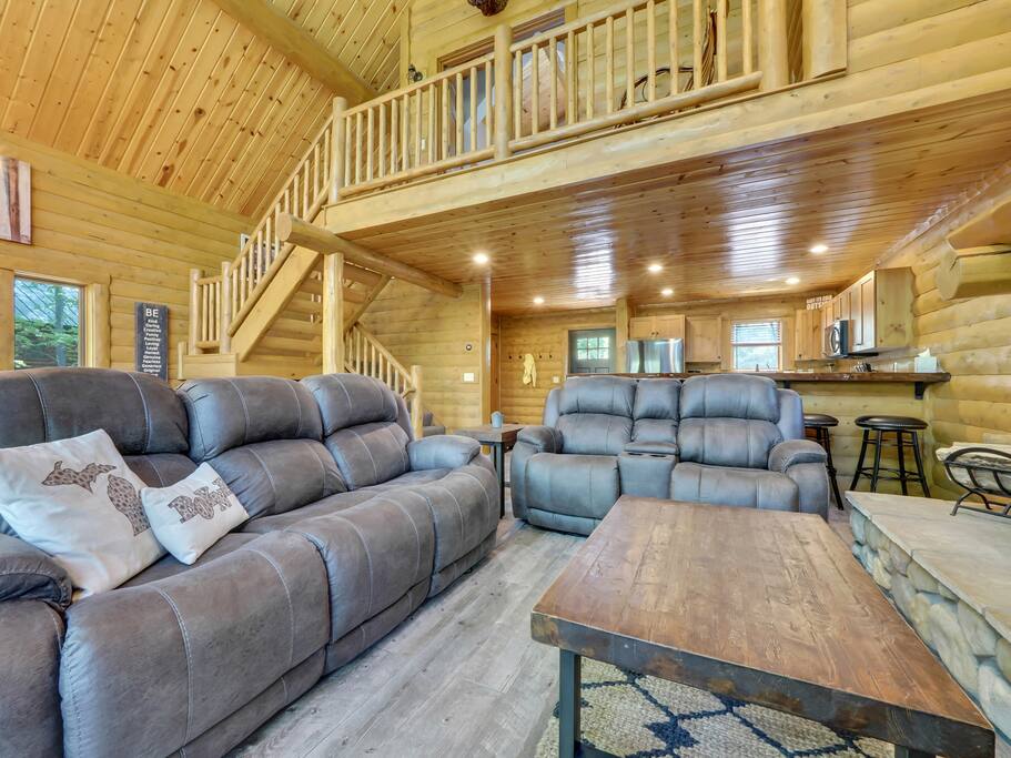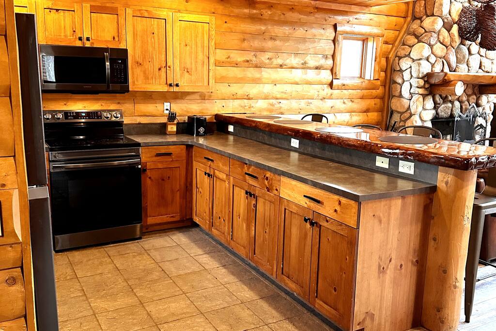 The main level of our charming cabin boasts a spacious living area perfect for family gatherings, featuring a warm and inviting wood-burning fireplace where you can cozy up and warm your toes after a day of outdoor activities. The expansive kitchen is fully equipped with modern appliances, providing everything you need to prepare delicious meals. Enjoy your culinary creations in the cozy dining area that comfortably accommodates the whole family.
