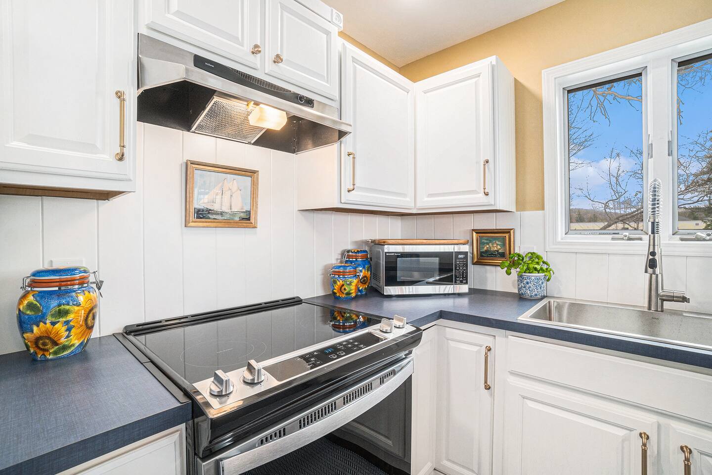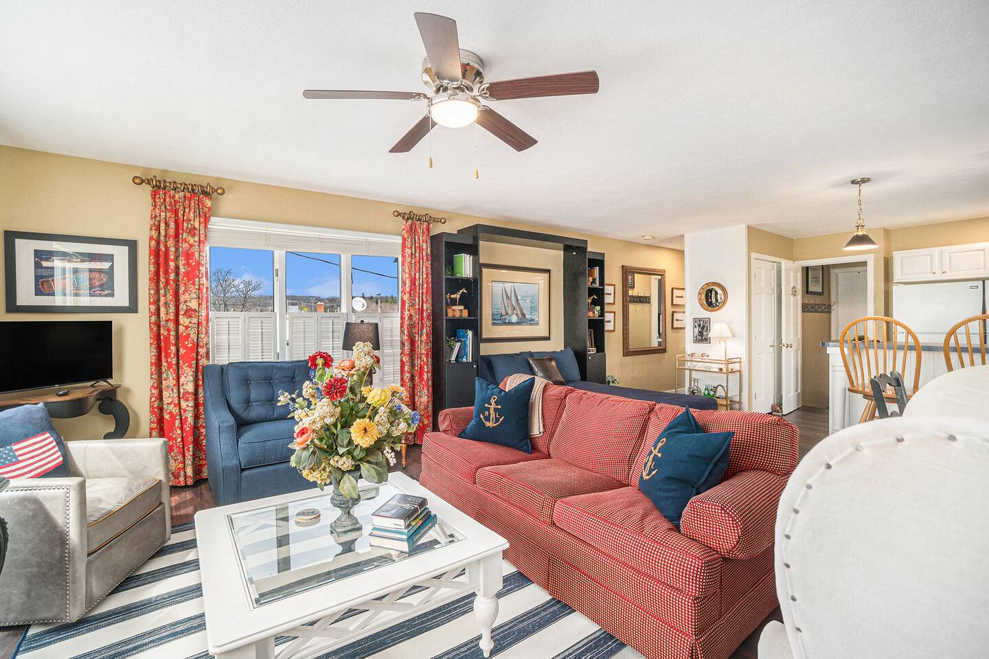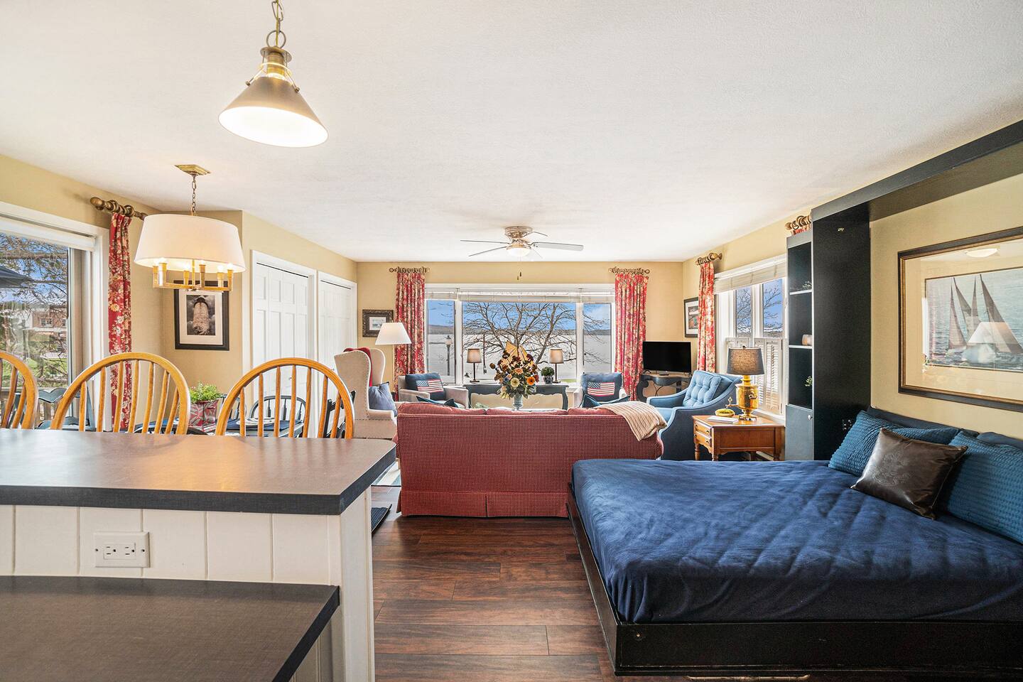 Inside, you’ll find a spacious, fully stocked kitchen—perfect for cooking meals after a day on the water or trails. The living room features both a comfortable queen-size Murphy bed and a sofa sleeper, while the private bedroom includes a full over full bunk bed, making this a great option for families or small groups. The newly remodeled bathroom adds a touch of modern comfort, and there’s a convenient in-unit washer and dryer for your use.