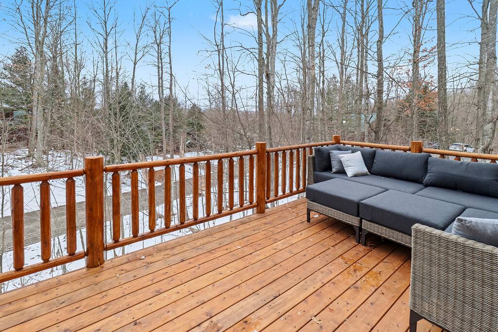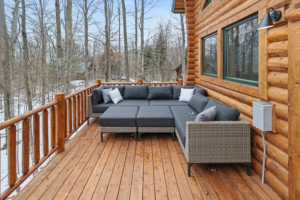 Deck surrounded by woods featuring a private hot tub and outdoor furniture with seating for relaxing and enjoying the mountain setting.